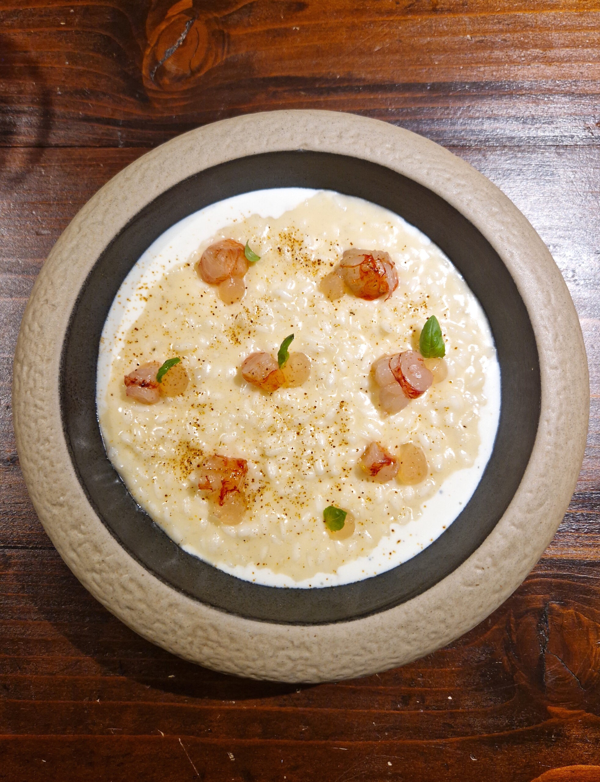 Risotto “Cascina Salera” con gambero rosso, burrata, gel e polvere di pomodoro