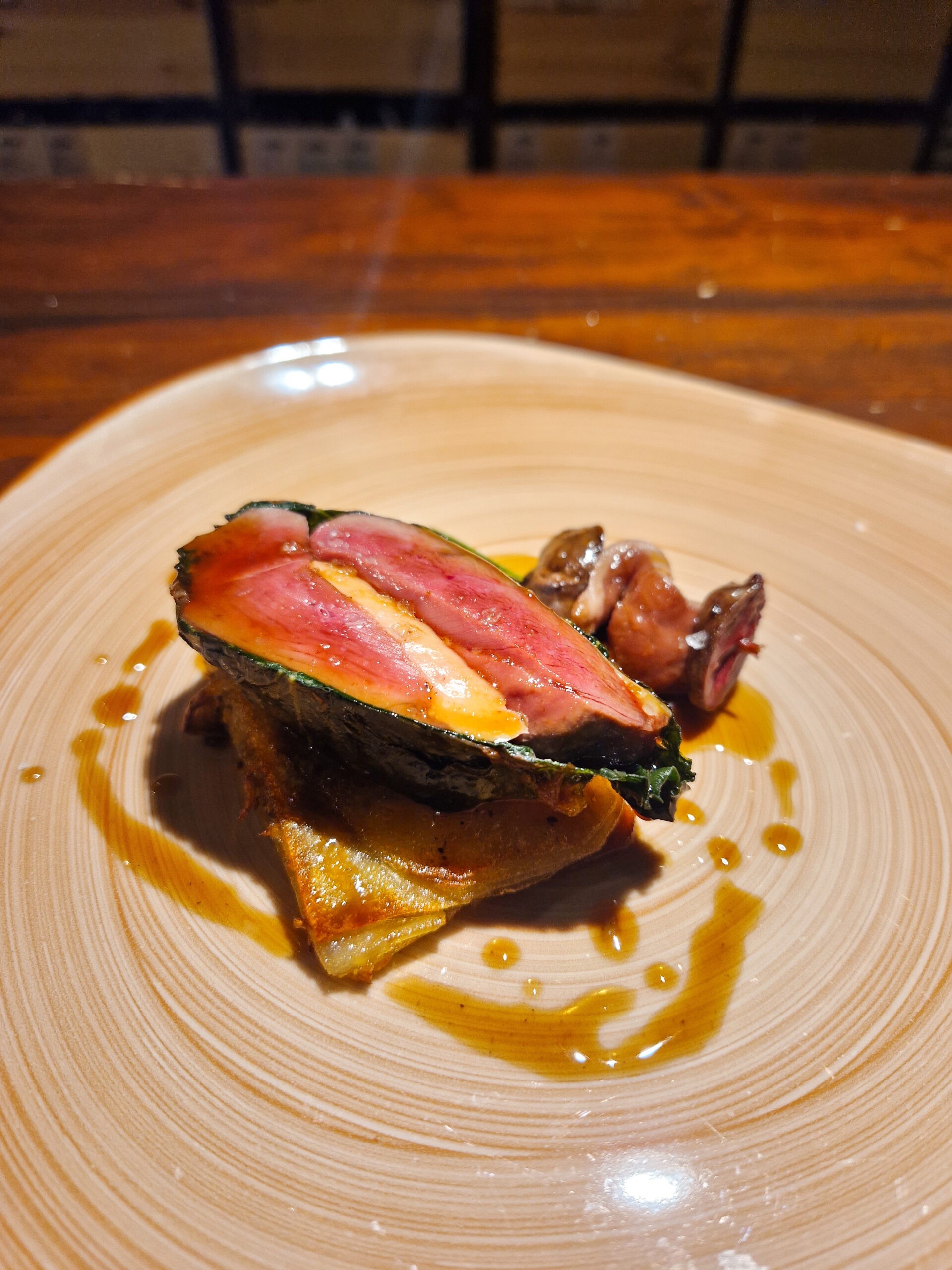 Piccione farcito spiedino di frattaglie, terrina di patate e scalogno